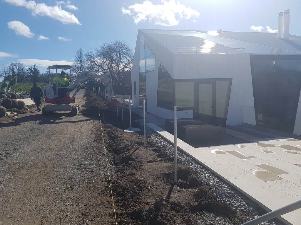 Die Villa in Herrliberg besteht aus dem Haupthaus und zwei Gästehäusern. Optisch besticht dieses Objekt durch die schiefwinklige, in Beton ausgeführte Fassade und das pyramidenartige Betondach. Ein Indoor Infinity Pool ermöglicht freien Blick in die Tiefgarage. Die Baugrubensicherung wurde mittels einer Nagelwand gelöst.
