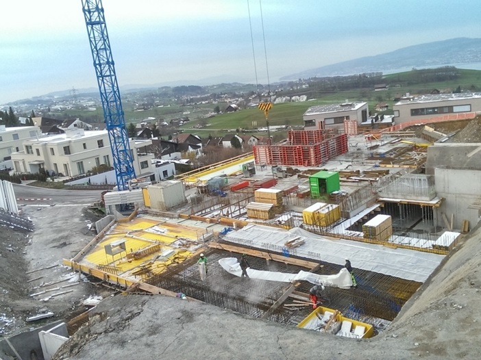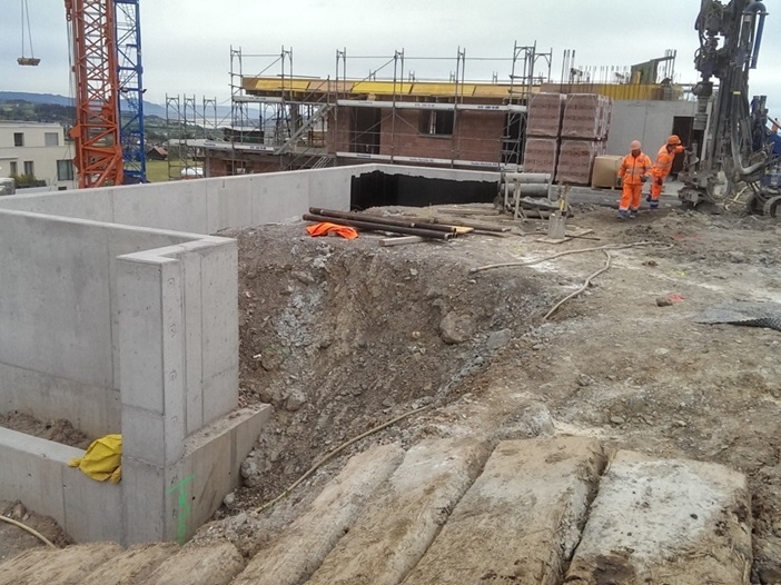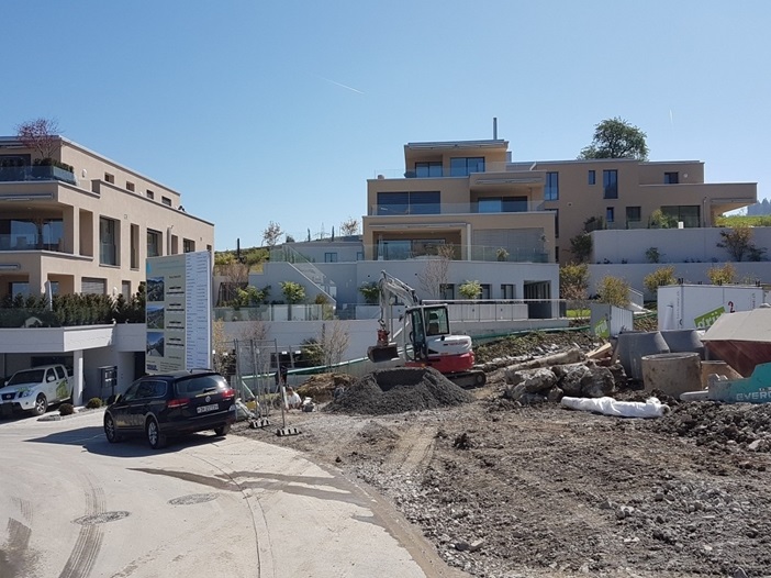 Neubau von zwei Mehrfamilienhäusern auf einer gemeinsamen Tiefgarage im Hang. Die Baugrube hat eine maximale Tiefe von 14m. Die Baugrubensicherung wurde als Nagelwand und teilweise mit Böschungen und Filterbetonabdeckungen erstellt. Die Raumhöhen der TG betragen zwischen 2.60m bis 5.80m, um die Terrainhöhen der Terrassierungen zu erreichen. Die Tiefgarage wurde mit 35cm bis maximal 3.50m Erde überschüttet gemäss der Terraingestaltung. Es waren diverse Stützmauern bei den Absätzen zu den verschiedenen Niveaus erforderlich. Für den oberen Bereich des südlichen Gebäudes wurde die Bodenplatte auf einer Aufschüttung auf Mikropfählen fundiert. Der Abschluss der Aufschüttung nach Westen wird durch eine 6m hohe Stützmauer begrenzt.